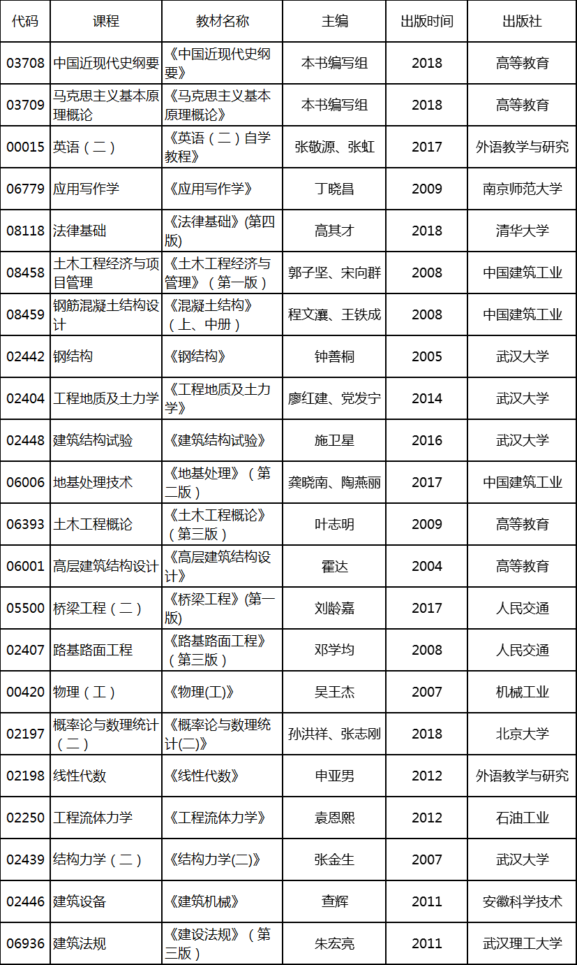 2020年4月湖北自考土木工程專業(yè)考試時間和考試教材(專升本)