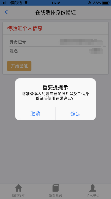 2)點(diǎn)擊(開始驗(yàn)證,提示請準(zhǔn)備本人藍(lán)底登記照片和二代身份證,如下圖: