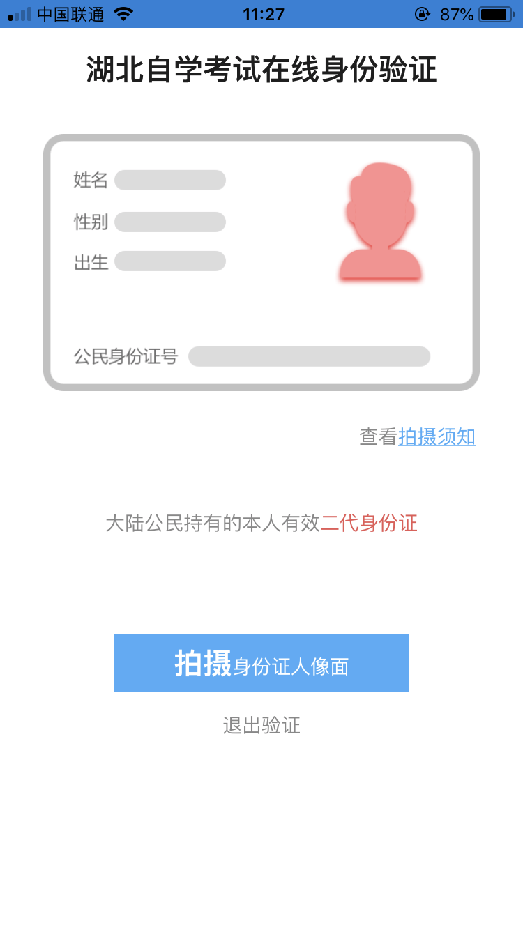 3)點(diǎn)擊(確定,進(jìn)入湖北自學(xué)考試在線身份驗(yàn)證頁面,如下圖: