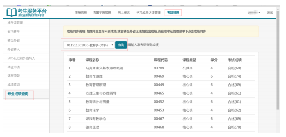 考生登錄湖北省高等教育自學(xué)考試考生服務(wù)平臺,進(jìn)入考籍管理--專業(yè)成績查詢頁面,可以選擇一個(gè)本人的專業(yè)來查詢成績(如下圖所示),成績查詢不出來請先在準(zhǔn)考證管理中同步成績。
