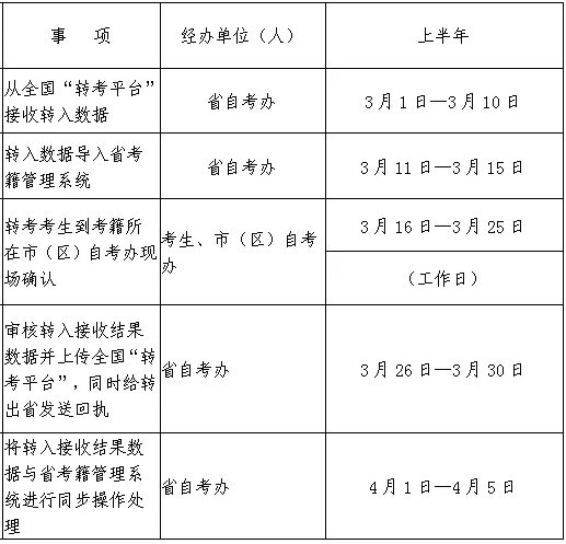 4、省自考辦將轉(zhuǎn)入辦理結(jié)果上傳全國(guó)“轉(zhuǎn)考平臺(tái)”,核準(zhǔn)后給轉(zhuǎn)出省發(fā)送回執(zhí)。
