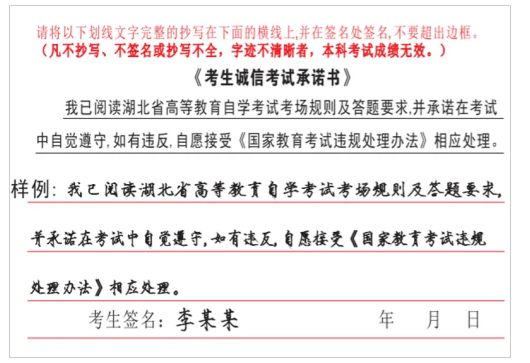 1.落實(shí)筆跡信息采集要求。考生應(yīng)在答題卡指定區(qū)域完整抄寫《考生誠信考試承諾書》(抄寫樣例如下圖),凡不抄寫、不簽名或抄寫不全,字跡不清晰者,該科考試成績無效。畢業(yè)時省教育考試院將對每張答題卡上的《考生誠信考試承諾書》筆跡進(jìn)行復(fù)核,凡筆跡不一致、經(jīng)鑒定為代考的,將根據(jù)《國家教育考試違規(guī)處理辦法》作出成績作廢、延遲畢業(yè)、記入國家教育考試誠信檔案等處理。
