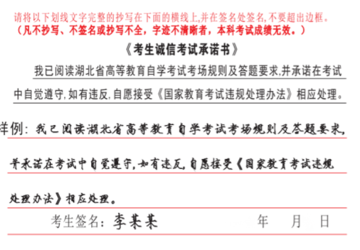 1.落實筆跡信息采集要求。考生應(yīng)在答題卡指定區(qū)域完整抄寫《考生誠信考試承諾書》(抄寫樣例如下圖),凡不抄寫、不簽名或抄寫不全,字跡不清晰者,該科考試成績無效。畢業(yè)時省教育考試院將對每張答題卡上的《考生誠信考試承諾書》筆跡進行復(fù)核,凡筆跡不一致、經(jīng)鑒定為代考的,將根據(jù)《國家教育考試違規(guī)處理辦法》作出成績作廢、延遲畢業(yè)、記入國家教育考試誠信檔案等處理。
