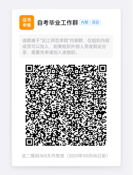 5.擬參加畢業(yè)申報的學(xué)生,請用“釘釘”APP掃碼加入漢江師范學(xué)院繼續(xù)教育學(xué)院發(fā)起的釘釘群聊:“自考畢業(yè)工作群”,此次畢業(yè)申報的工作通知、相關(guān)附件、反饋情況會隨時通過此群發(fā)布,請注意查看。