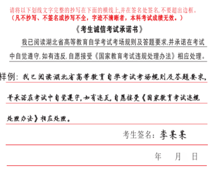 落實(shí)筆跡信息采集要求。考生應(yīng)在答題卡指定區(qū)域完整抄寫《考生誠信考試承諾書》(抄寫樣例如下圖),凡不抄寫、不簽名或抄寫不全,字跡不清晰者,該科考試成績無效。考生畢業(yè)時,省教育考試院將對每張答題卡上的《考生誠信考試承諾書》筆跡進(jìn)行復(fù)核,凡筆跡不一致、經(jīng)鑒定為代考的,將根據(jù)《國家教育考試違規(guī)處理辦法》作出成績作廢、延遲畢業(yè)、記入國家教育考試誠信檔案等處理。