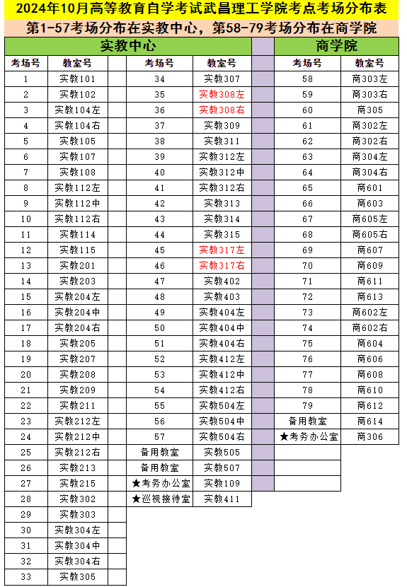 3、進(jìn)校后根據(jù)學(xué)校門口的平面圖和考場分布表(如附件1.2024年10月自考武昌理工學(xué)院考場分布表)。武昌理工學(xué)院考點考場分布為:第1-57考場在實驗教學(xué)中心大樓,58-79考場在商學(xué)院大樓。考生需提前找到考試樓棟及考場所在教室號,避免走錯考場。