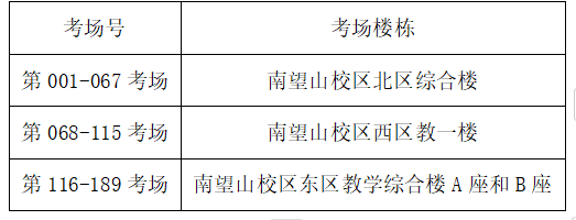 1.考試地點(diǎn)根據(jù)考場(chǎng)號(hào)分別設(shè)在中國(guó)地質(zhì)大學(xué)(武漢)南望山校區(qū)北區(qū)綜合樓、西區(qū)教一樓以及東區(qū)教學(xué)綜合樓A座和B座,為了便于大家查找,請(qǐng)各位考生根據(jù)自己考場(chǎng)號(hào)對(duì)應(yīng)的考場(chǎng)樓棟進(jìn)行導(dǎo)航。