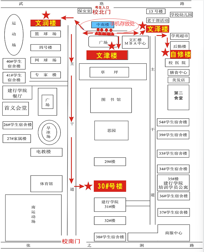 1.考生入校后,根據(jù)路標(biāo)指引前往手機存放點入口(中南樓一樓大廳北門)。