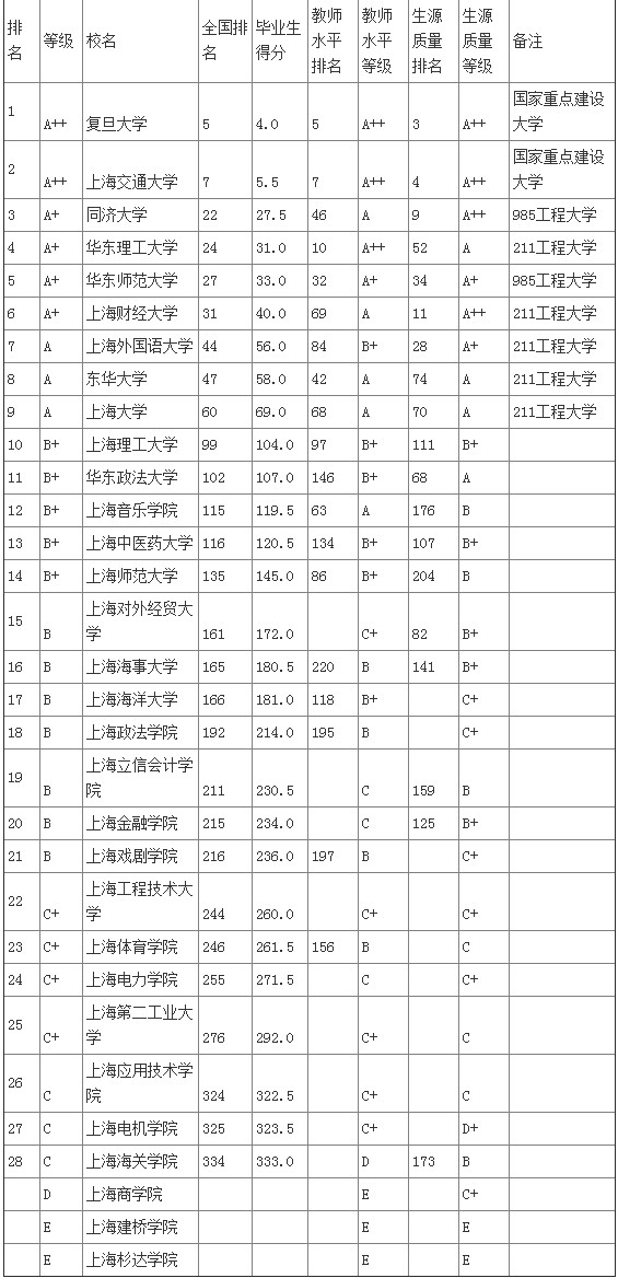在本排行榜中,本科畢業(yè)生質(zhì)量C級及以上的,列出排名和等級,C級以下的只列等級,不列排名。教師平均學術(shù)水平在B級及以上的,列出排名和等級,B級以下的只列等級,不列排名;