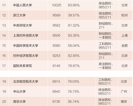 上榜的100所院校中,只有14所為二本院校!這意味著要想未來(lái)薪酬高,在報(bào)考大學(xué)時(shí)依然要選擇一本以上的大學(xué),尤其是211工程院校和985工程院校。百?gòu)?qiáng)榜中的前十名為清華大學(xué)、復(fù)旦大學(xué)、上海財(cái)經(jīng)大學(xué)、北京大學(xué)、上海交通大學(xué)、外交學(xué)院、上海外國(guó)語(yǔ)大學(xué)、同濟(jì)大學(xué)、北京外國(guó)語(yǔ)大學(xué)、北京郵電大學(xué)。這些都是響當(dāng)當(dāng)?shù)闹袊?guó)名校。