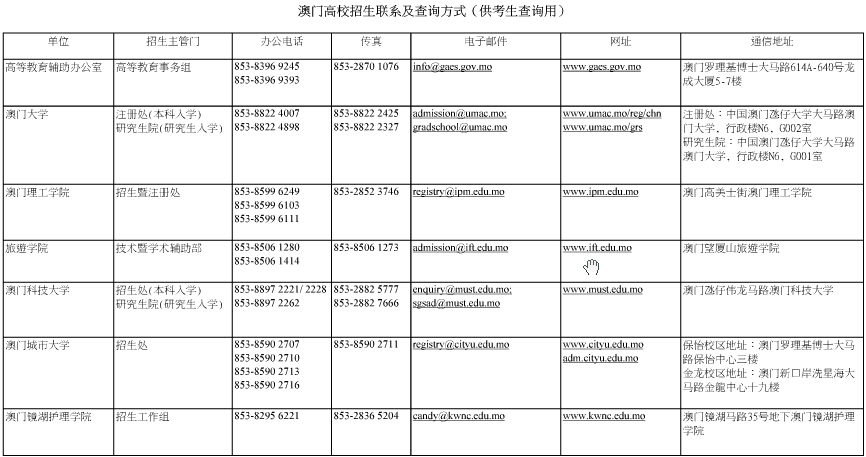 湖北高考網(wǎng)獲悉,2015年澳門(mén)高校招生聯(lián)系及查詢(xún)方式如下: