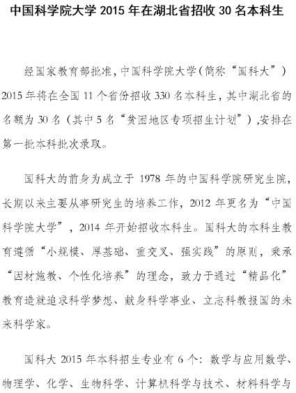 湖北高考網(wǎng)獲悉,2015年中國科學(xué)院大學(xué)計(jì)劃在湖北省招收30名本科生,詳情如下: