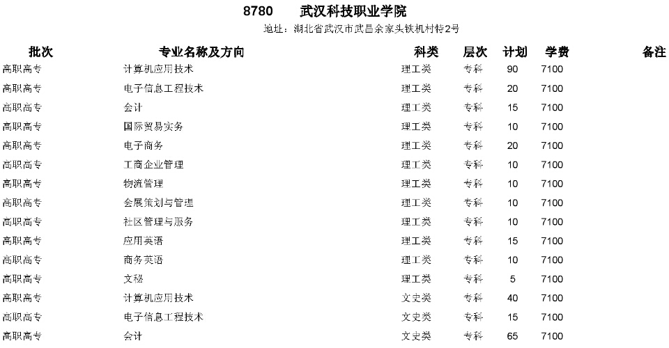 年武漢科技職業(yè)學(xué)院2015在湖北省招生計劃