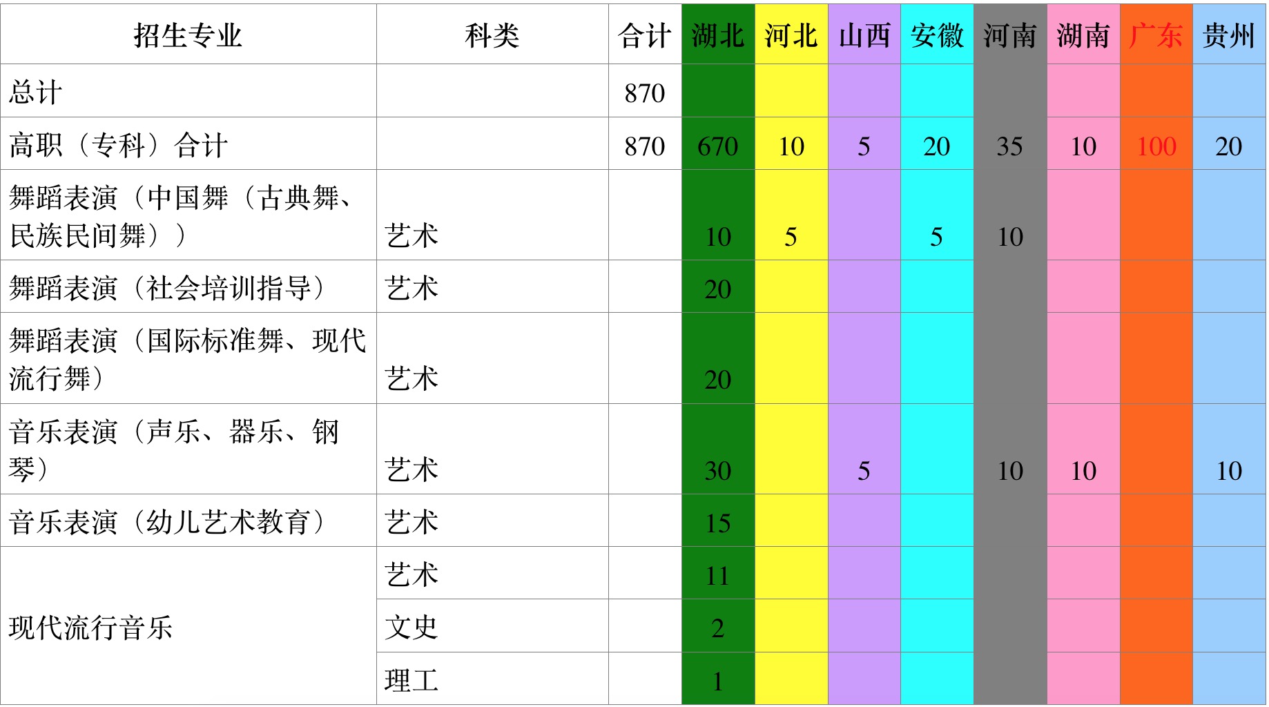 湖北藝術(shù)職業(yè)學院2015年分省分專業(yè)招生計劃