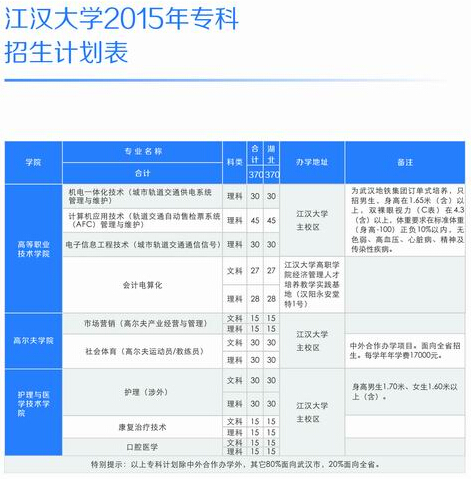 湖北高考網(wǎng)獲悉,2015年江漢大學(xué)專科招生計(jì)劃如下: