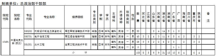 中國(guó)地質(zhì)大學(xué)(武漢)2015年國(guó)防生招生計(jì)劃