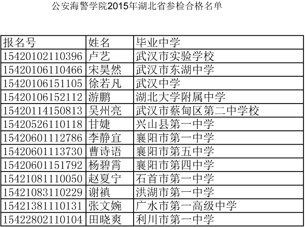 公安海警學(xué)院2015年湖北考生參檢合格名單