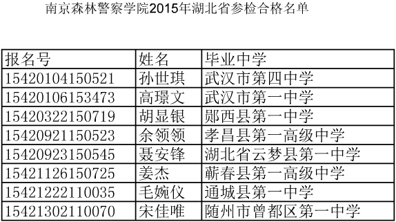 南京森林警察學(xué)院2015年湖北考生參檢合格名單