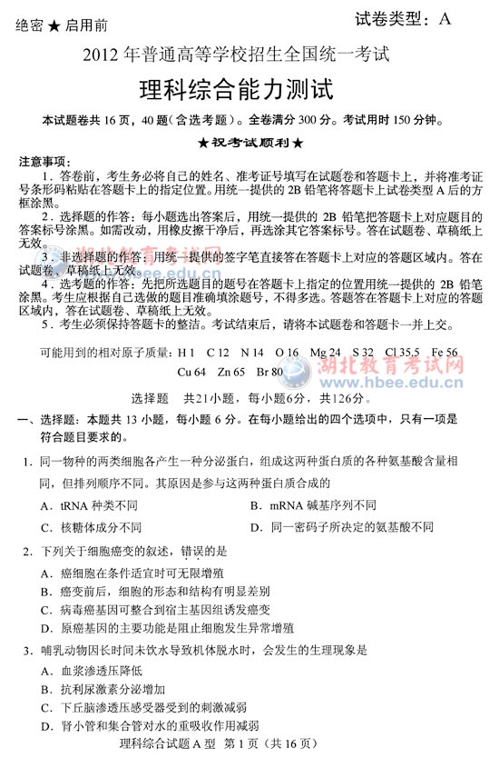 "2012年湖北省高考理綜A卷試題" 相關(guān)文章推薦