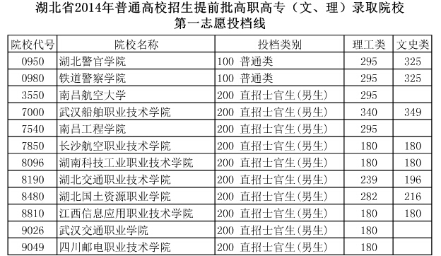 湖北2014年提前批文理類高職高專錄取院校第一志愿投檔線