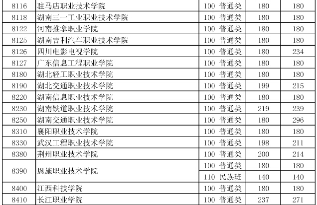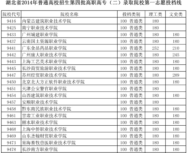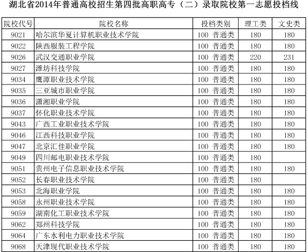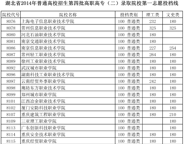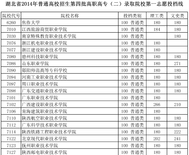 湖北2014年高招第四批高職高專(二)錄取院校第一志愿投檔線