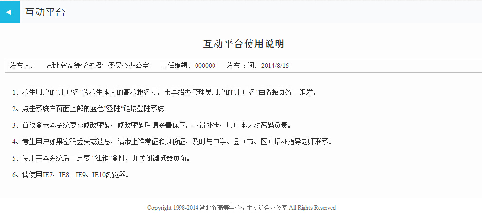 1.請(qǐng)按照網(wǎng)上填報(bào)志愿程序填報(bào)補(bǔ)錄征集志愿。省招辦公布了“湖北省普通高校招生多元互動(dòng)錄取平臺(tái)”網(wǎng)上填報(bào)志愿操作圖解,請(qǐng)考生仔細(xì)閱讀,按步驟操作。補(bǔ)錄征集志愿網(wǎng)報(bào)系統(tǒng)網(wǎng)址:http://tbzy.hubzs.com.cn/。考生登錄密碼為高考結(jié)束后網(wǎng)上填報(bào)志愿密碼,如果密碼忘記或遺失的考生,可以憑準(zhǔn)考證和身份證向縣市招辦申請(qǐng)恢復(fù)初始密碼,恢復(fù)初始密碼后,考生應(yīng)及時(shí)登錄系統(tǒng)更改初始密碼。>>>