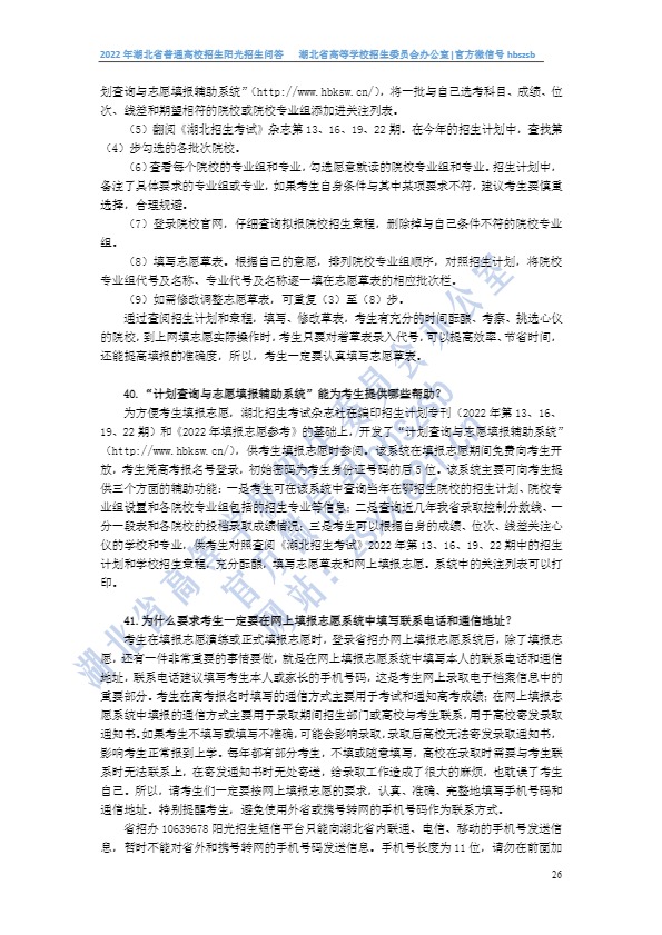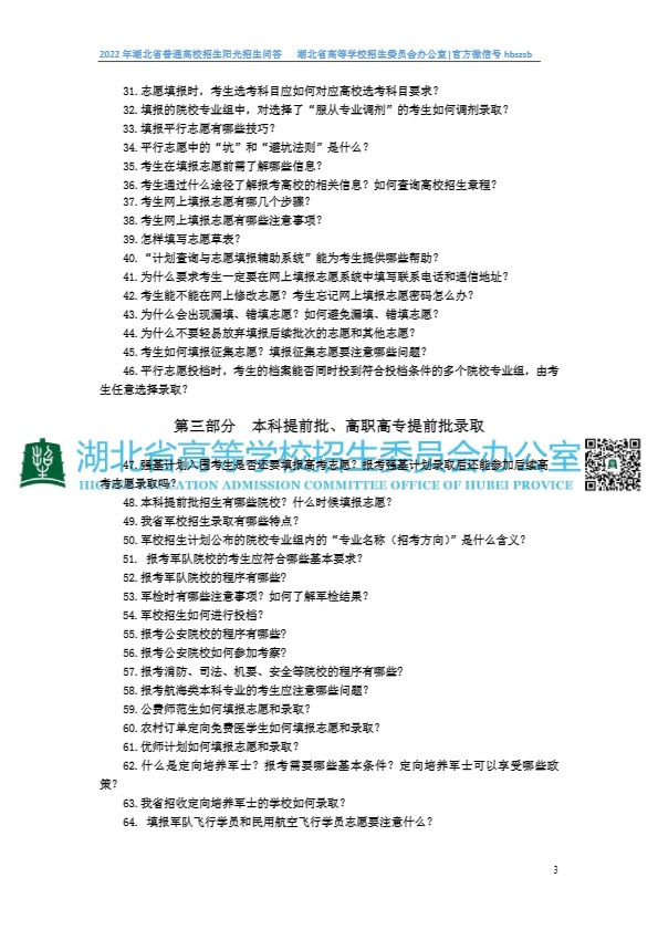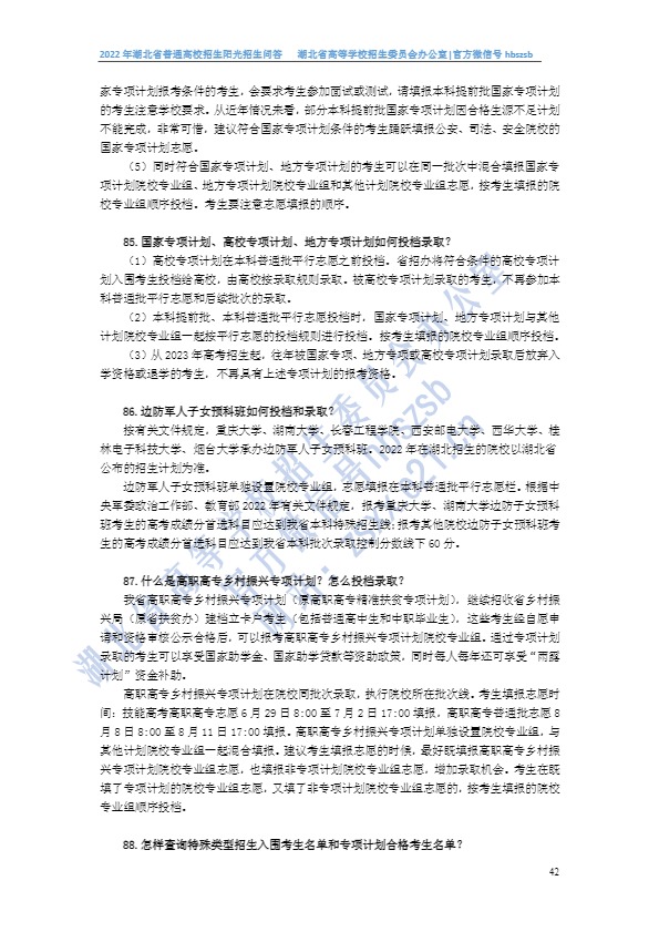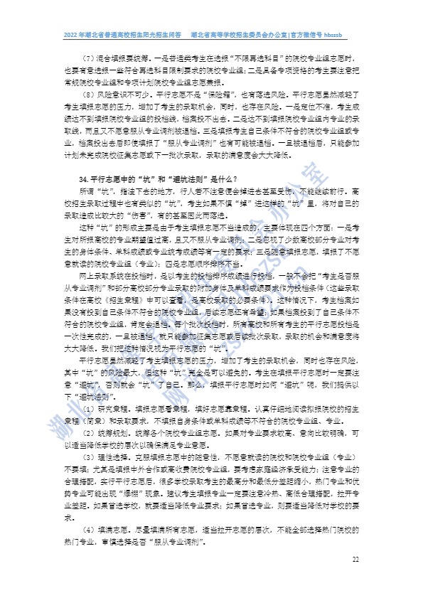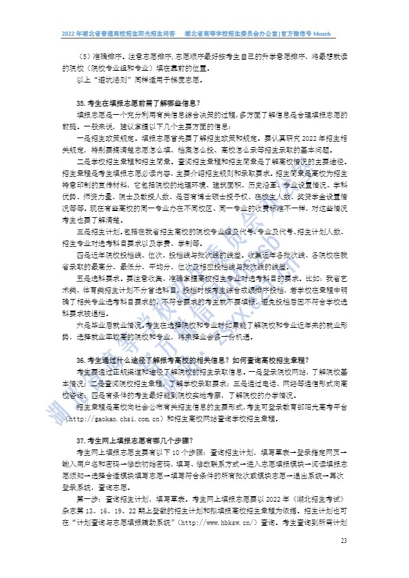 2022年06月15日,湖北省招辦發(fā)布了2022年湖北省普通高校招生陽光招生問答,問答中收錄了高考政策規(guī)定、填報志愿須知、不同類型考生注意事項等考生疑惑比較多的問題和解答,供大家參考。