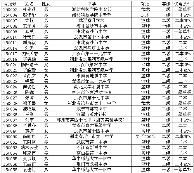 湖北高考網(wǎng)獲悉,2015年武漢理工大學高水平運動隊招生入圍資格名單已公布,詳情如下: