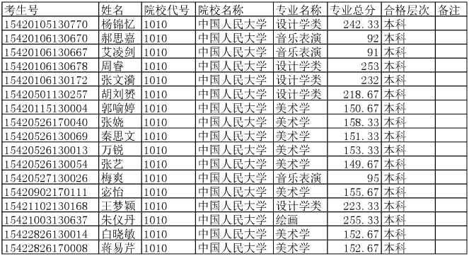 中國人民大學2015年在湖北省招生藝術(shù)專業(yè)合格考生名單