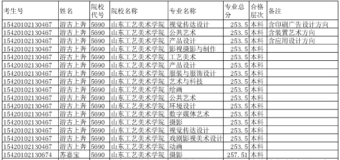 山東工藝美術學院2015年在湖北省招生藝術專業(yè)合格考生名單