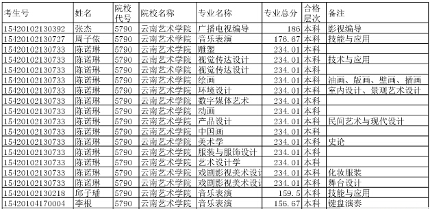云南藝術學院2015年在湖北省招生藝術專業(yè)合格考生名單