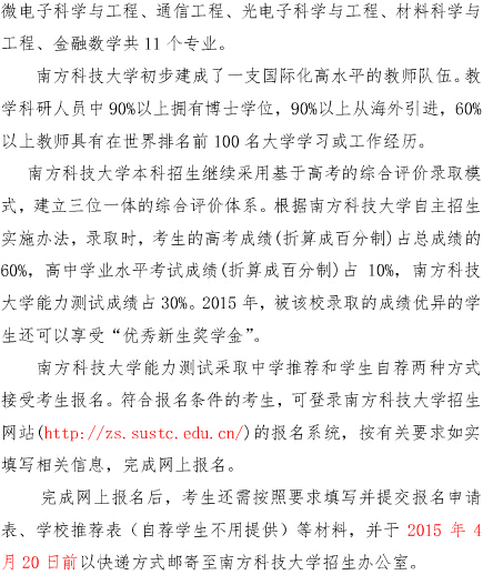 湖北高考網(wǎng)獲悉,2015年南方科技大學(xué)自主招生能力測試已經(jīng)開始報(bào)名。詳情如下: