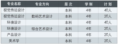 設(shè)有視覺傳達(dá)設(shè)計、視覺傳達(dá)設(shè)計(數(shù)碼藝術(shù)設(shè)計方向)、環(huán)境設(shè)計、環(huán)境設(shè)計(綜合藝術(shù)設(shè)計方向)、產(chǎn)品設(shè)計及美術(shù)學(xué)專業(yè)。