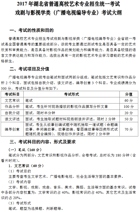 2017年湖北省藝術(shù)統(tǒng)考(廣播電視編導(dǎo)專業(yè))考試大綱
